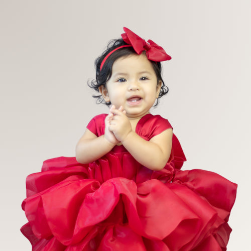 Let your little one shine bright in our Ruby Bow Babydoll Dress, a stunning piece made for magical moments! This charming red dress features layers of soft tulle for a dreamy, twirl-worthy silhouette and a dazzling oversized bow adorned with...