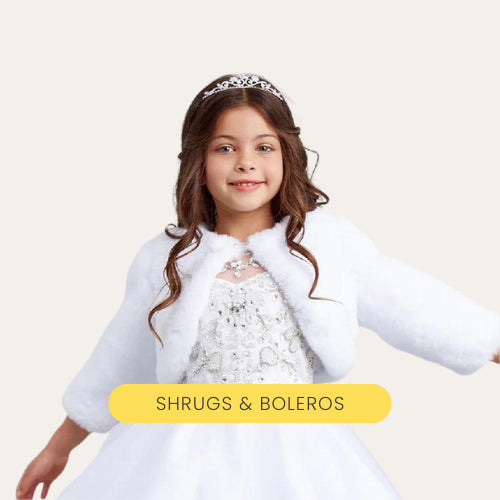 No flower girl ensemble is complete without the right finishing touches. Explore our collection of Flower Girl Shoes, featuring comfortable yet stylish designs that will keep her twirling all day. Add a touch of sparkle with tiaras, headbands, or floral crowns, and don’t forget a dainty pair of gloves for a touch of vintage charm. For cooler ceremonies, our Shrugs & Boleros offer a chic layer of warmth.